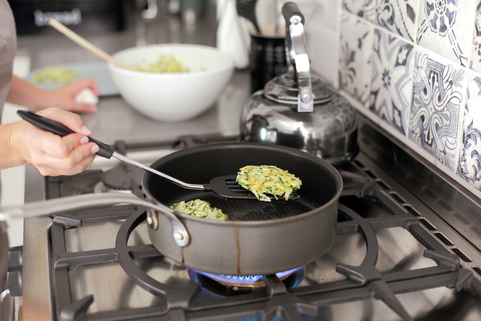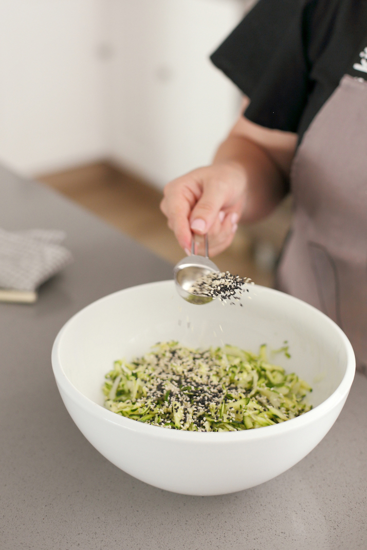 - Mix the potato, zucchini, flour, oil and seeds together. Now shape 12 fritters (about ¼ cup of mixture for each). Heat some vegetable oil in a pan and once it is hot, shallow fry the fritters until golden brown on both sides. Be sure to shape them and press down as you go along. Place on a paper towel to drain the majority of the oil off.
