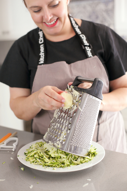 - Grate the zucchini and potato coarsely, then squeeze out as much liquid as possible. Pat dry with a kitchen towel.