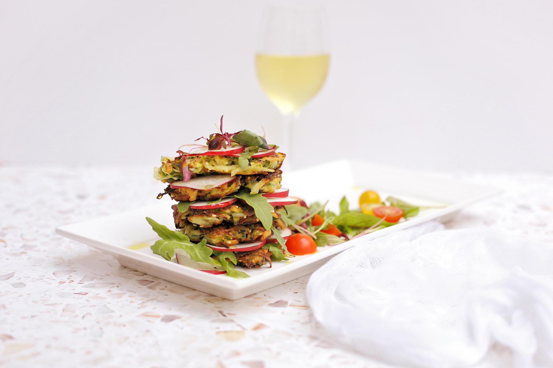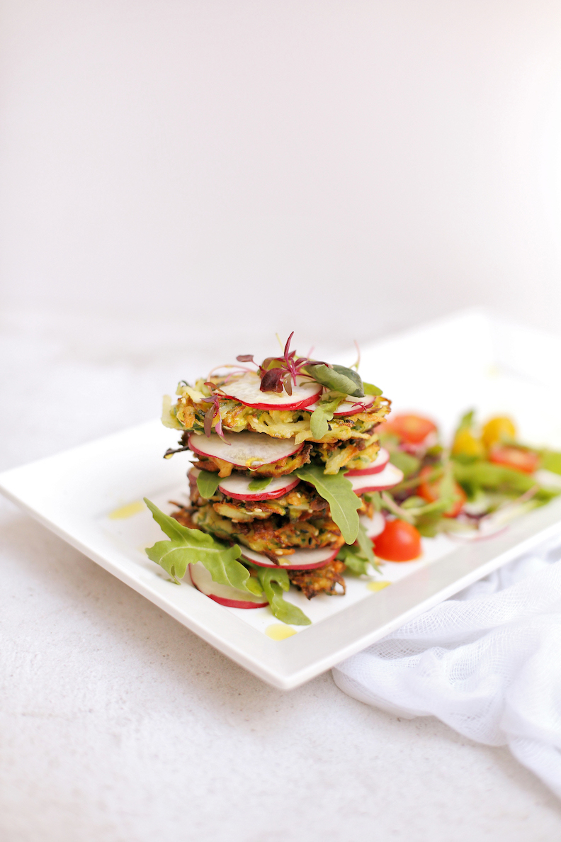 - Gently slide slices of radish and some rocket leaves in between the fritters as you plate them up. Top with micro greens. Serve with a simple salad of tomato and rocket tossed with olive oil, white wine vinegar, salt and pepper.