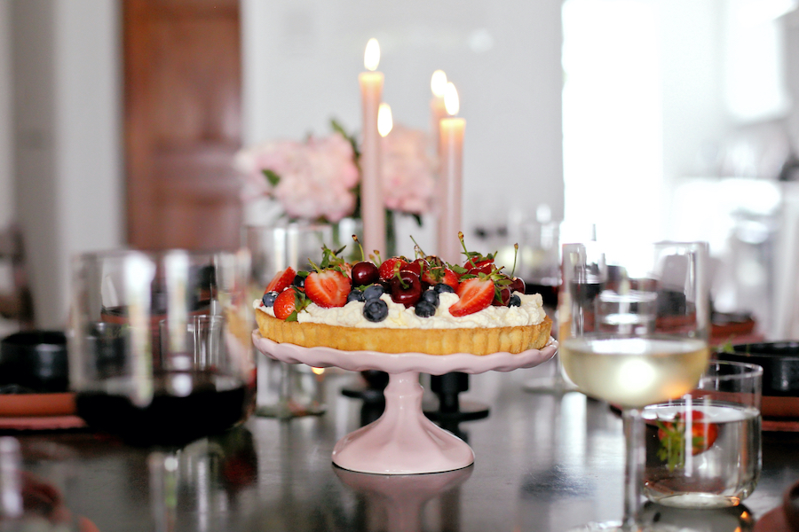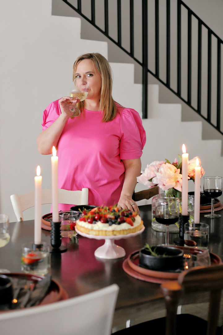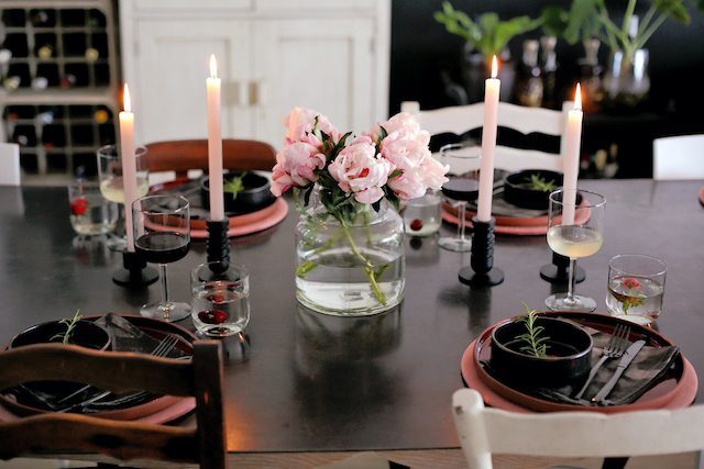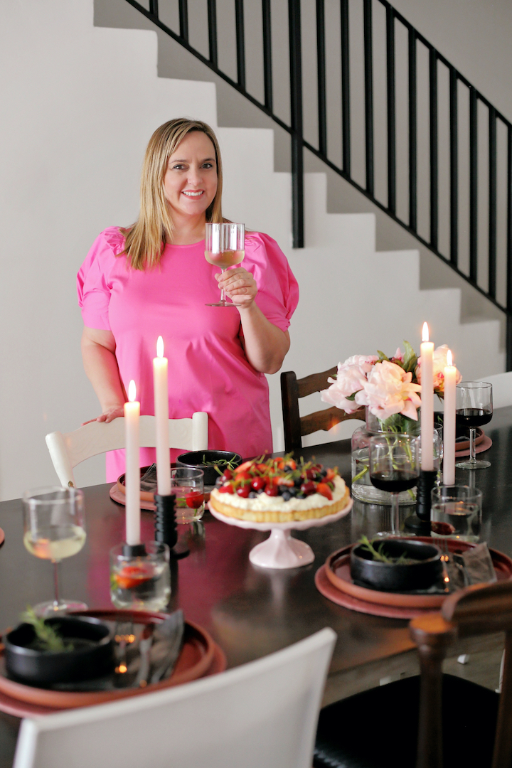 Go with a color scheme. I love the pinks in this setting. It is soft and gentle and creates the perfect ambiance for an evening with my girlfriends. When I saw the pink peonies & the seasonal berries, I just had to add them to this tablescape. Monochrome always works well. Then add seasonal flowers & seasonal fruit to your table – it’s always a winner.
