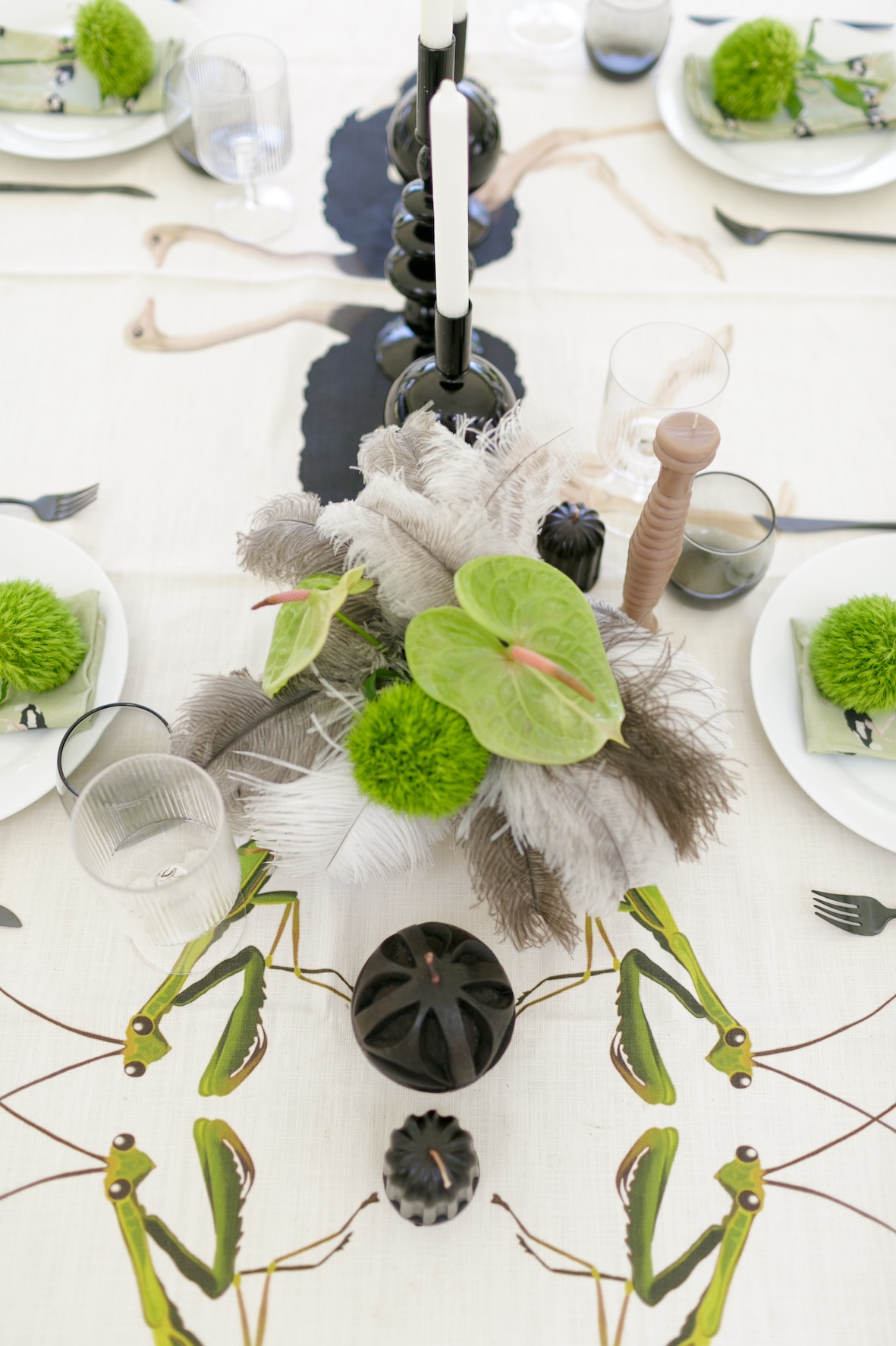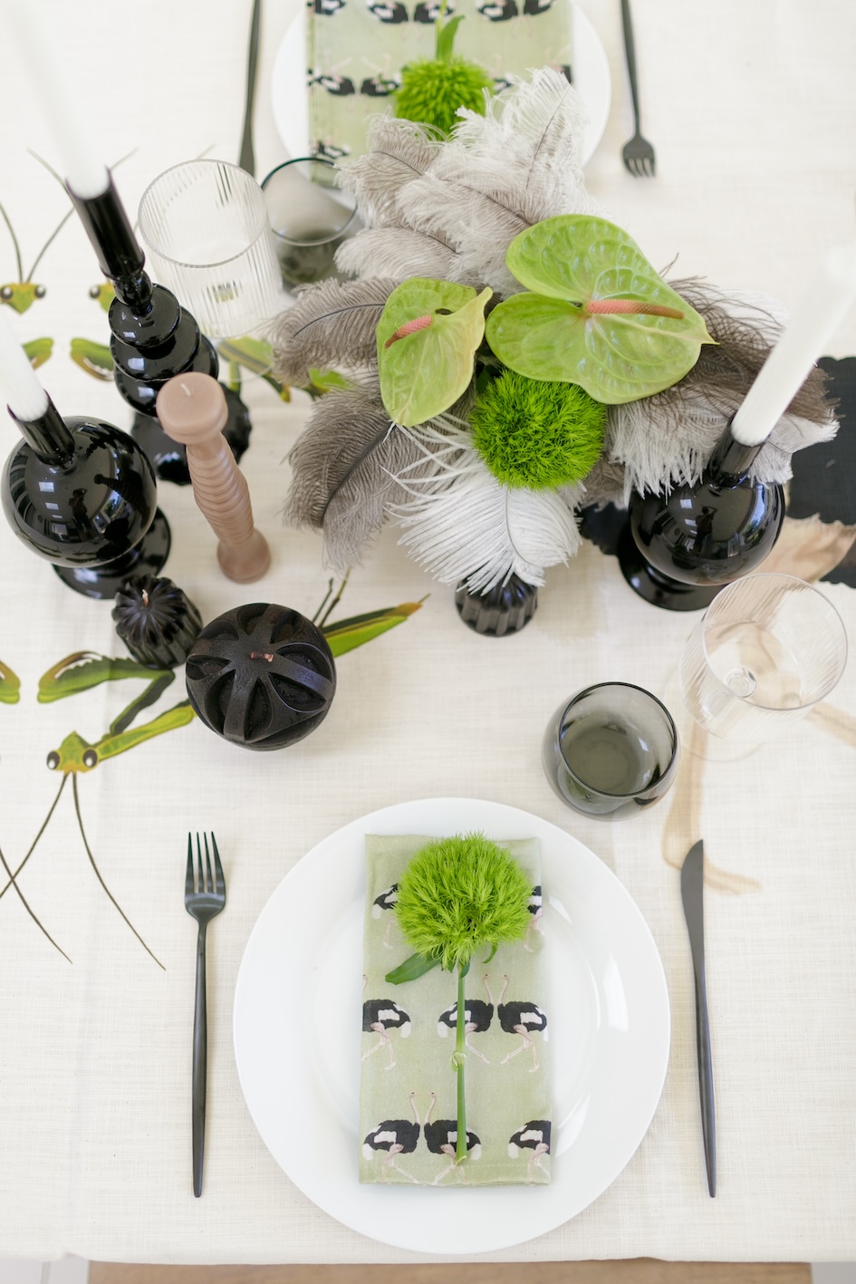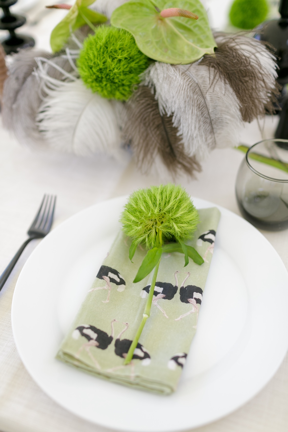 The feathers worked really well with some striking modern green flowers like the Green Ball™ Dianthus and the green arum lilies. Next time I might add some succulents, Spekboom or fynbos. Wooden or woven items, like small baskets or leather napkin rings, could also complement the ostrich-inspired look.
