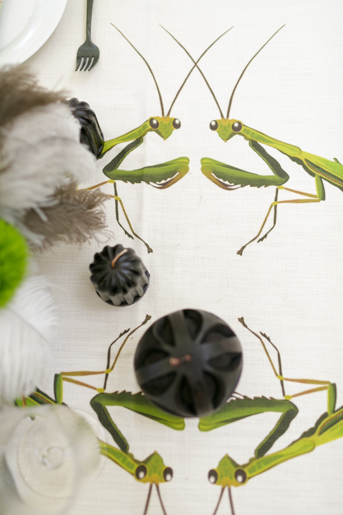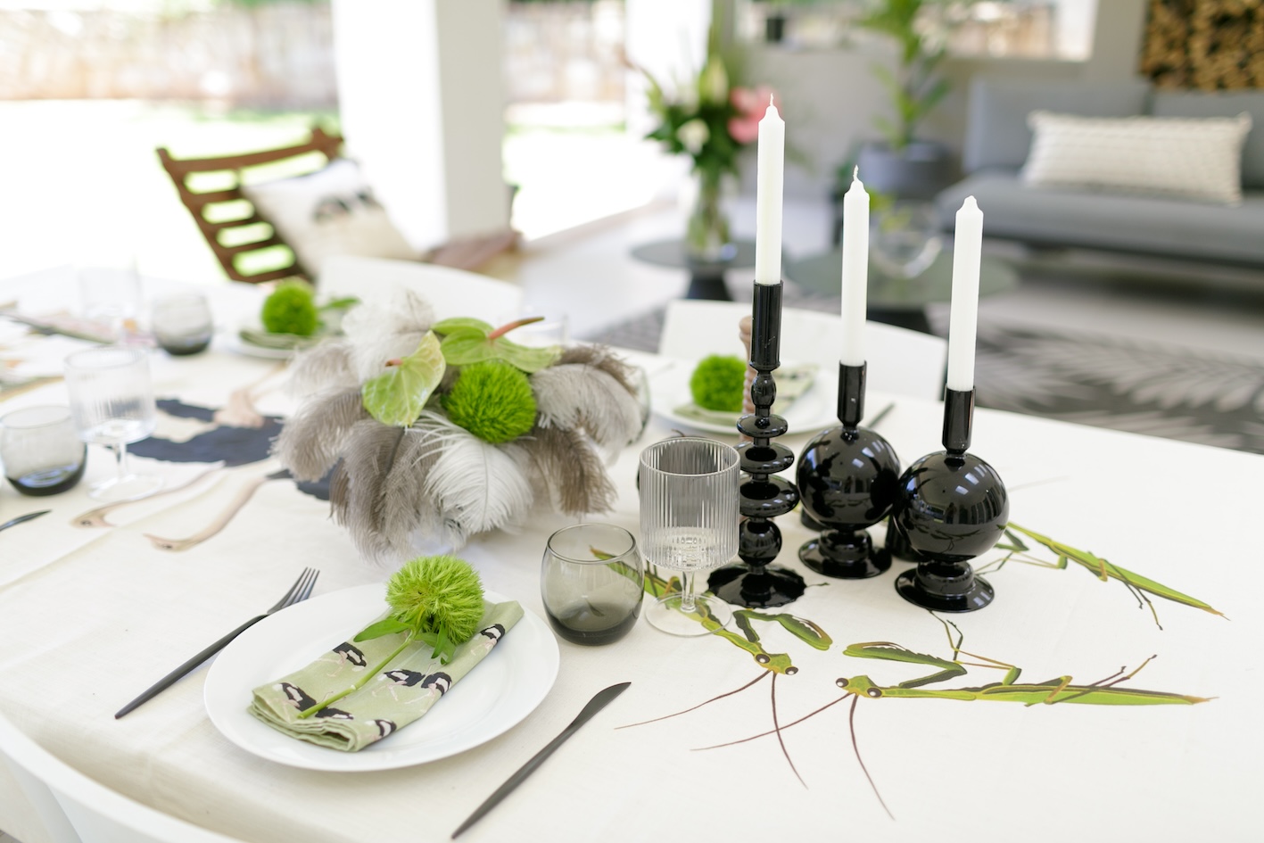 I chose plain matt black cutlery from Nicolson Russell and white plates to keep the look sleek, but you can also go for plates and bowls that incorporate African-inspired designs like geometric patterns. I used Rialheim’s An African Farm Tablecloth Ostrich Tablecloth.