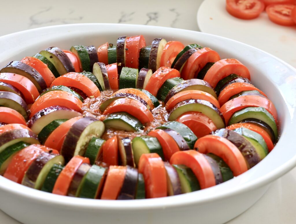 - Carefully pack the vegetables (aubergine, tomato, courgette) around the dish.