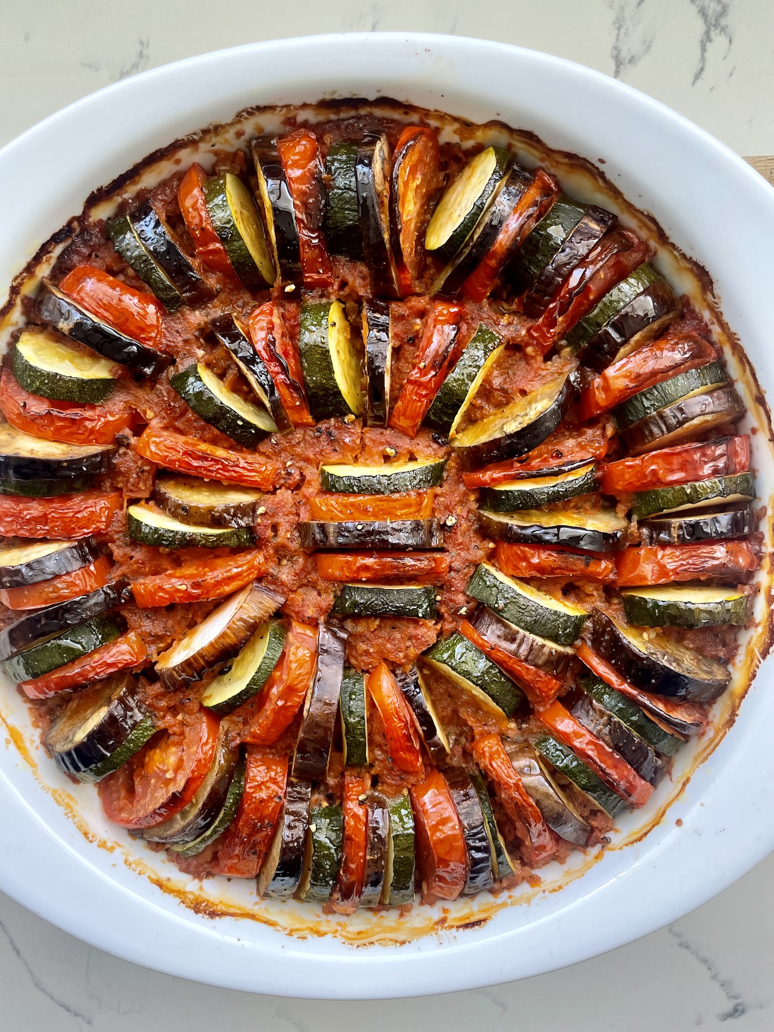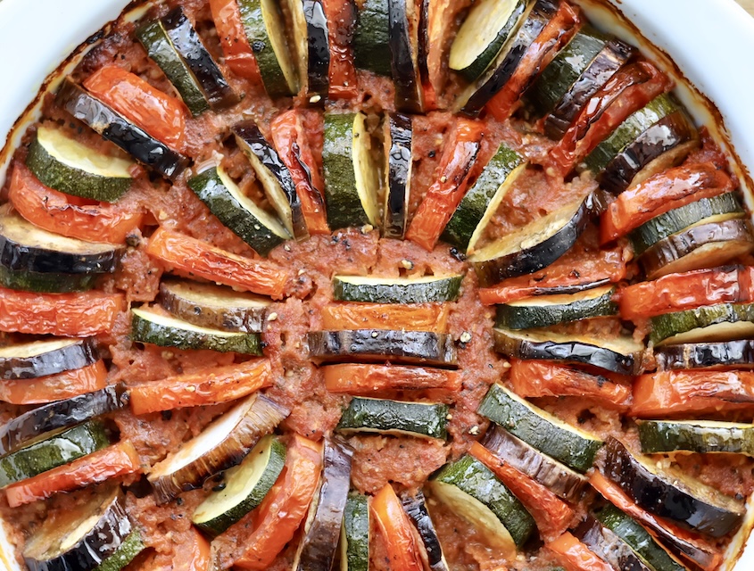 The less traditional baked version, like the one that I made here, is slightly more elegant & structured. You can still see & appreciate the beautiful colours of the aubergine, tomato, and courgette (baby marrow / zucchini). It’s the kind of dish that looks just as good as it tastes.